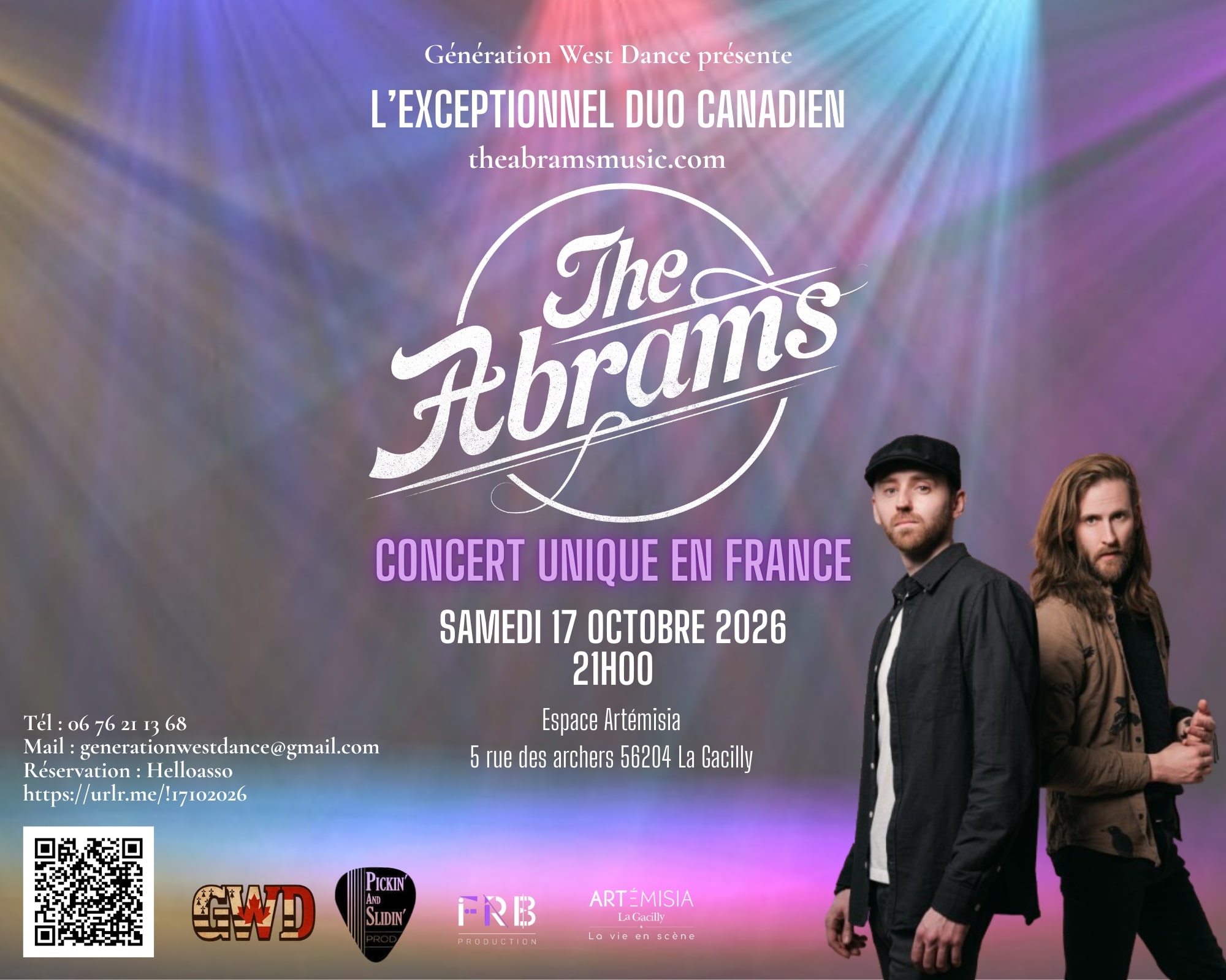 L'exceptionnel duo Canadien James & John Abrams The Abrams seront en concert unique en France avec leurs musiciens, samedi 17 Octobre 2026 à la salle de concert de l’Artémisia de la Gacilly, dans le Morbihan (56) grâce à la dynamique association GWD Génération West Dance.